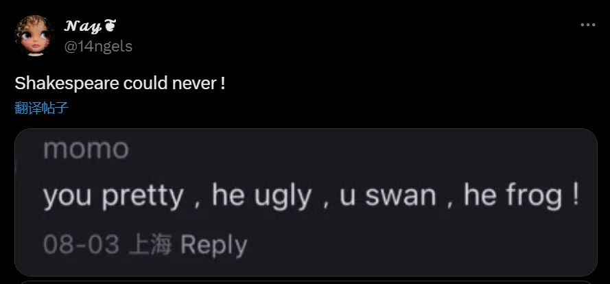 特别是,中国网友翻译的“癞蛤蟆想吃天鹅肉”: